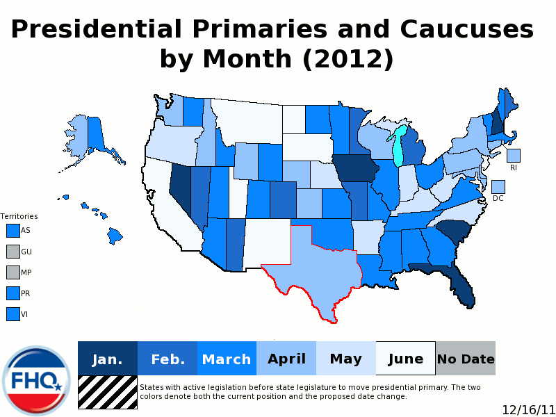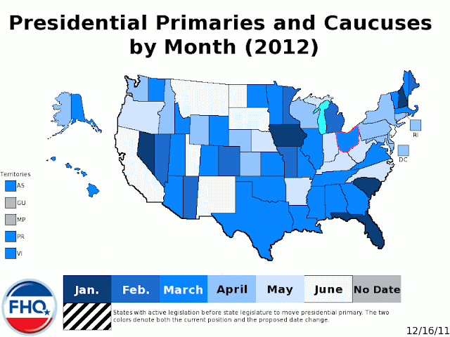 However, the move does have consequences as FHQ alluded to in our Texas post this morning. Sure, Rick Perry is going to have to win some contests (Iowa and South Carolina???) to survive long enough for the southern contests on March 6, but now the Texas governor can no longer rely on Texas on Super Tuesday. And once this gets into March, it may take more than wins -- more like wins with attendant large delegate margins -- to survive and advance. In other words, with Texas pushed even further back on the calendar, Perry's chance of survival, much less a path to the nomination, takes a hit.