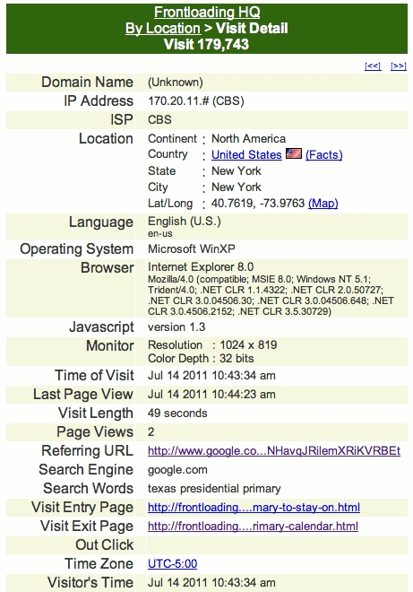 Look, I don't want to make too big a deal out of this, but I do want to point out this continuing trend (The AP routinely hangs out at the site and someone at the Daily Rundown was on the site for quite a while a couple of weeks ago researching prior to a rather feeble roundtable discussion of the primary calendar situation. Yes, I complained about that, too.). But someone from CBS was on the FHQ this morning at around 10:45 and lo and behold an article appeared on CBS News an hour and a half later. Now, sure that's only 49 seconds, but Sitemeter tabulates time between clicks, not overall time spent on the site. In other words, it doesn't accurately depict how long said CBS employee was on the site. But you'll notice that Texas (the search term via Google) and Super Tuesday are layered into the discussion in the item. And furthermore, the next stop was the overall 2012 presidential primary calendar.